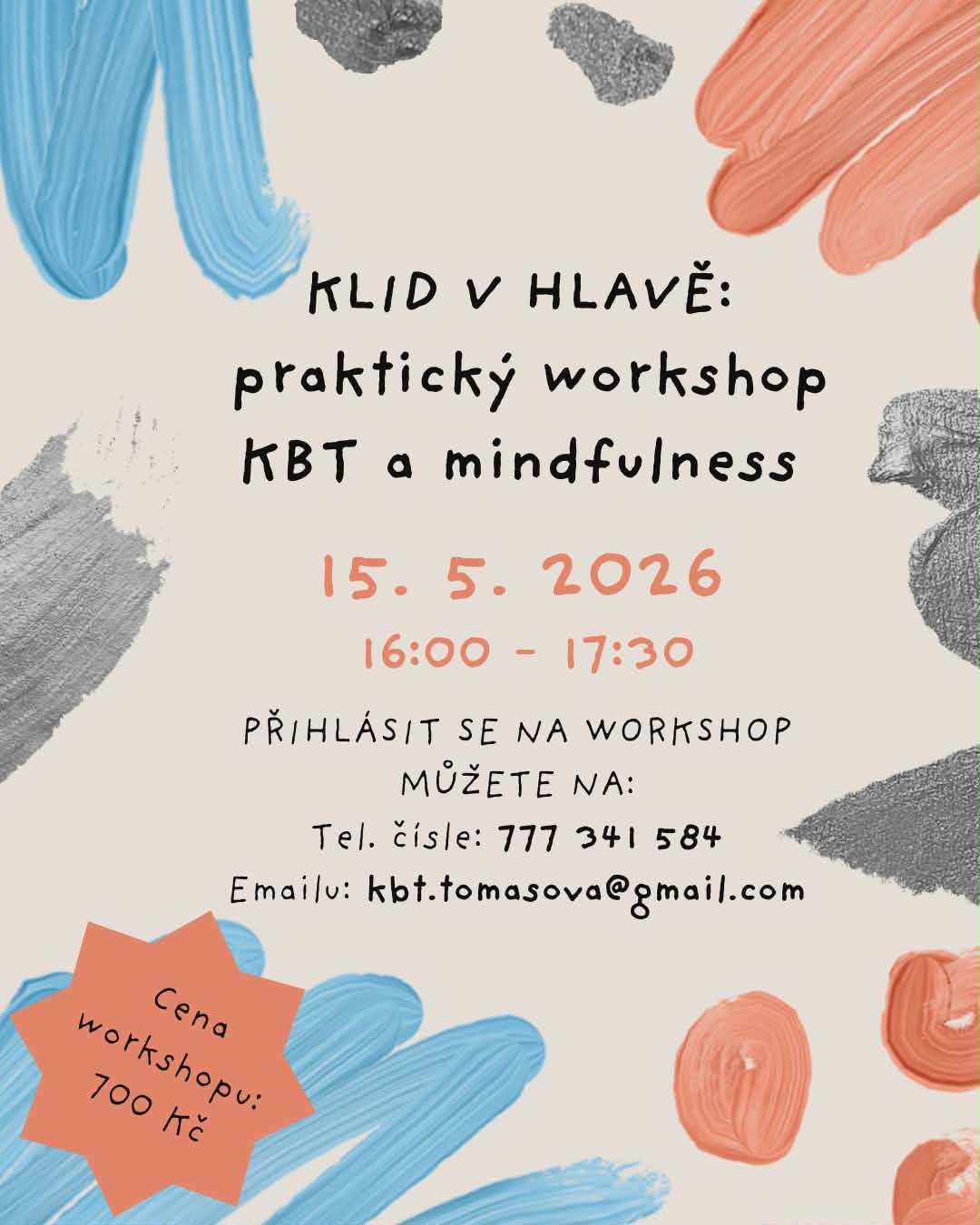 - Přihlásit se na workshop můžete na tel. čísle 777 341 584, emailu kbt.tomasova@gmail.com nebo pomocí kontaktního formuláře